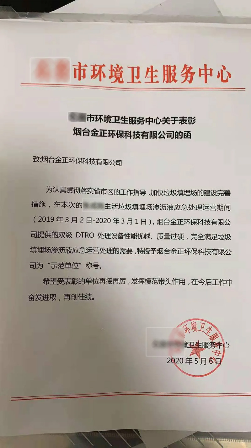 這些榮譽,滿載著的是客戶對金正環保DTRO產品優越的性能和過硬質量的肯定,高效率的團隊與優質的售后服務理念的認可,也是對我們的激勵和鞭策,更是我們一直以來不斷前進的動力源泉。