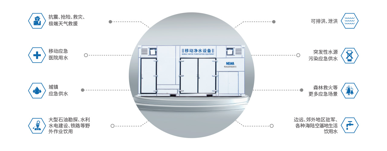 當(dāng)自然災(zāi)害及突發(fā)性水源污染事故發(fā)生時,需要一種能夠應(yīng)付不同水源的移動應(yīng)急凈水設(shè)備,滿足救援人員、受災(zāi)群眾和居民基本的用水需求。當(dāng)前,應(yīng)急救援對基本飲用水的保障措施通常為傳統(tǒng)工藝組裝的凈水車、瓶裝水運(yùn)輸?shù)确绞剑芗夹g(shù)限制、天氣路況等因素影響,不能安全、及時、連續(xù)的滿足飲用水供應(yīng)需求。因此,提供可移動式應(yīng)急所需、戰(zhàn)事所需、生活所需的移動凈水設(shè)備受到離度重視。